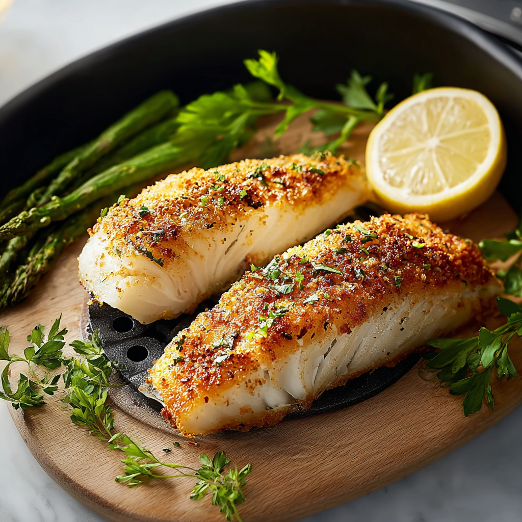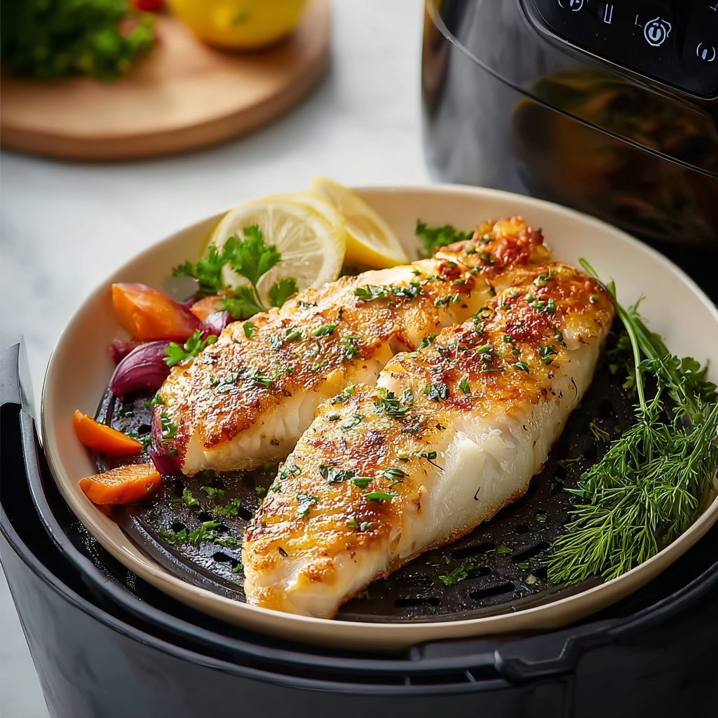 Remove the fillets carefully from the air fryer basket using a thin spatula — fish is delicate and the cooked fillet will be more fragile than raw. Transfer to serving plates and allow to rest for 2 minutes. Spoon the warm lemon herb sauce generously over the top of each fillet, finishing with a pinch of flaky sea salt, a scattering of fresh parsley or dill, and a wedge of lemon on the side. Serve immediately.