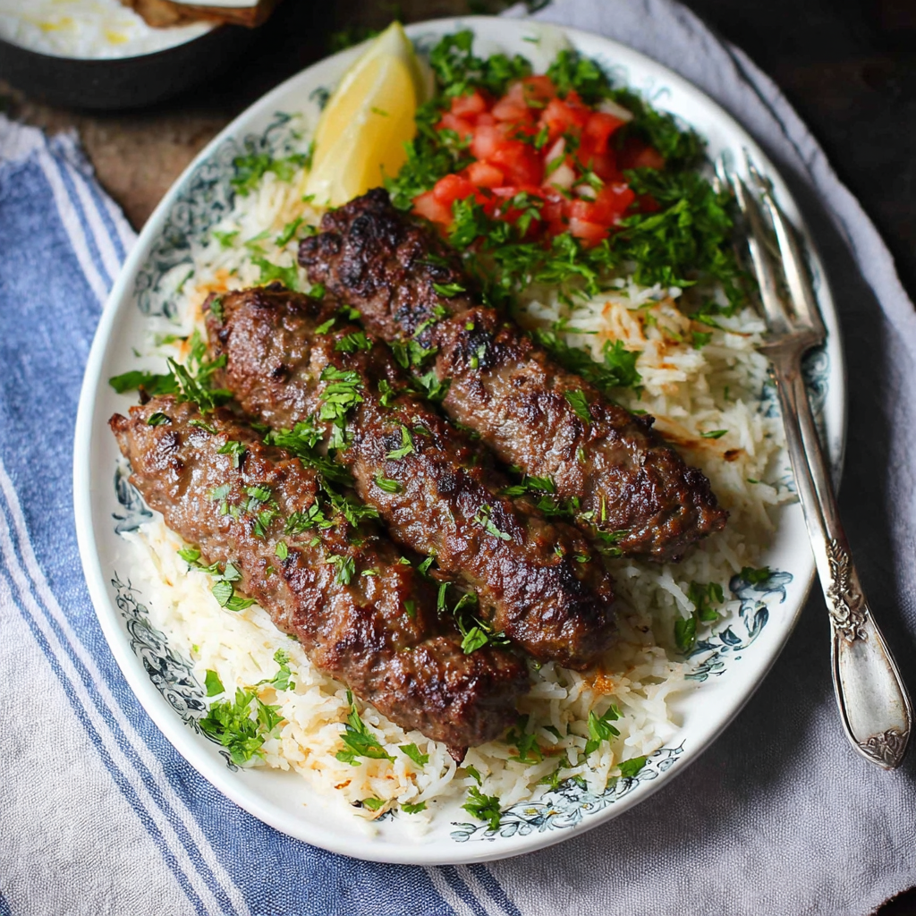Over Lebanese rice: Serve two kafta skewers over a plate of Lebanese vermicelli rice — white rice toasted with thin pasta noodles in butter — with a fattoush salad alongside. This is the family dinner format that has sustained generations of Lebanese home cooks.
