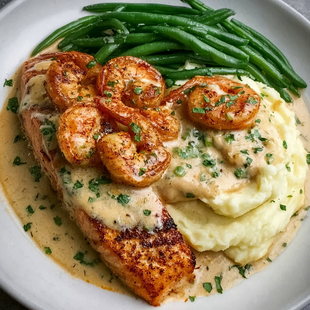 Cajun Shrimp and Salmon with Garlic Cream Sauce, Mashed Potatoes & Green Beans