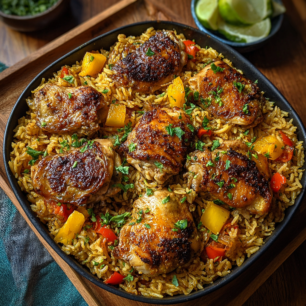 This Caribbean Chicken and Rice is a one-pot meal that brings together juicy spiced chicken, fluffy rice, and warm tropical seasonings.