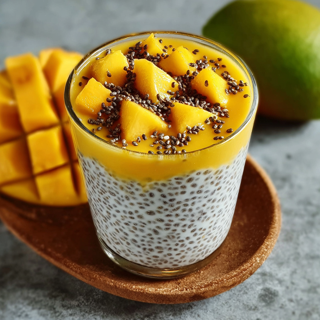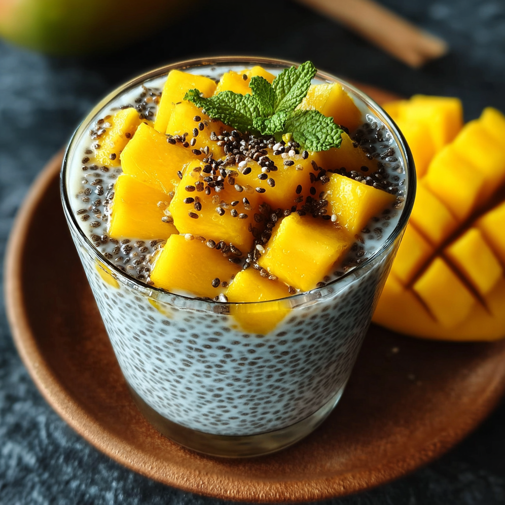 Layered parfait glasses: Layer the chia pudding and mango purée alternately in tall parfait glasses — three layers of each — for a visually dramatic, striped presentation that requires no garnish beyond a mint leaf to look professionally assembled.