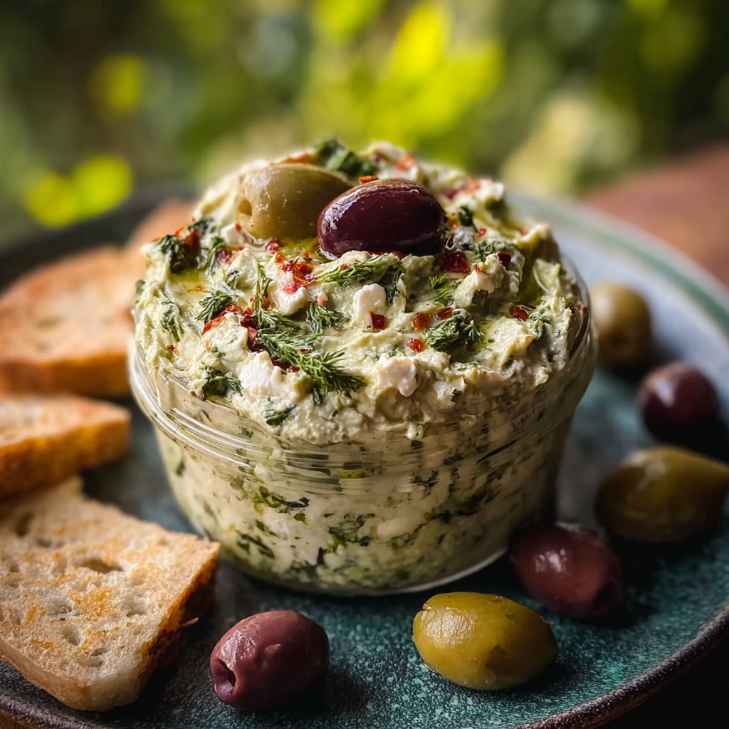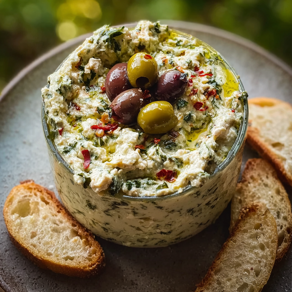 What green olives work best? Castelvetrano olives are the top choice — buttery, mild, and brilliantly green with a sweetness that balances the feta perfectly. Manzanilla is the most widely available alternative. Avoid stuffed or heavily marinated varieties, which muddy the clean flavor the spread is built around.