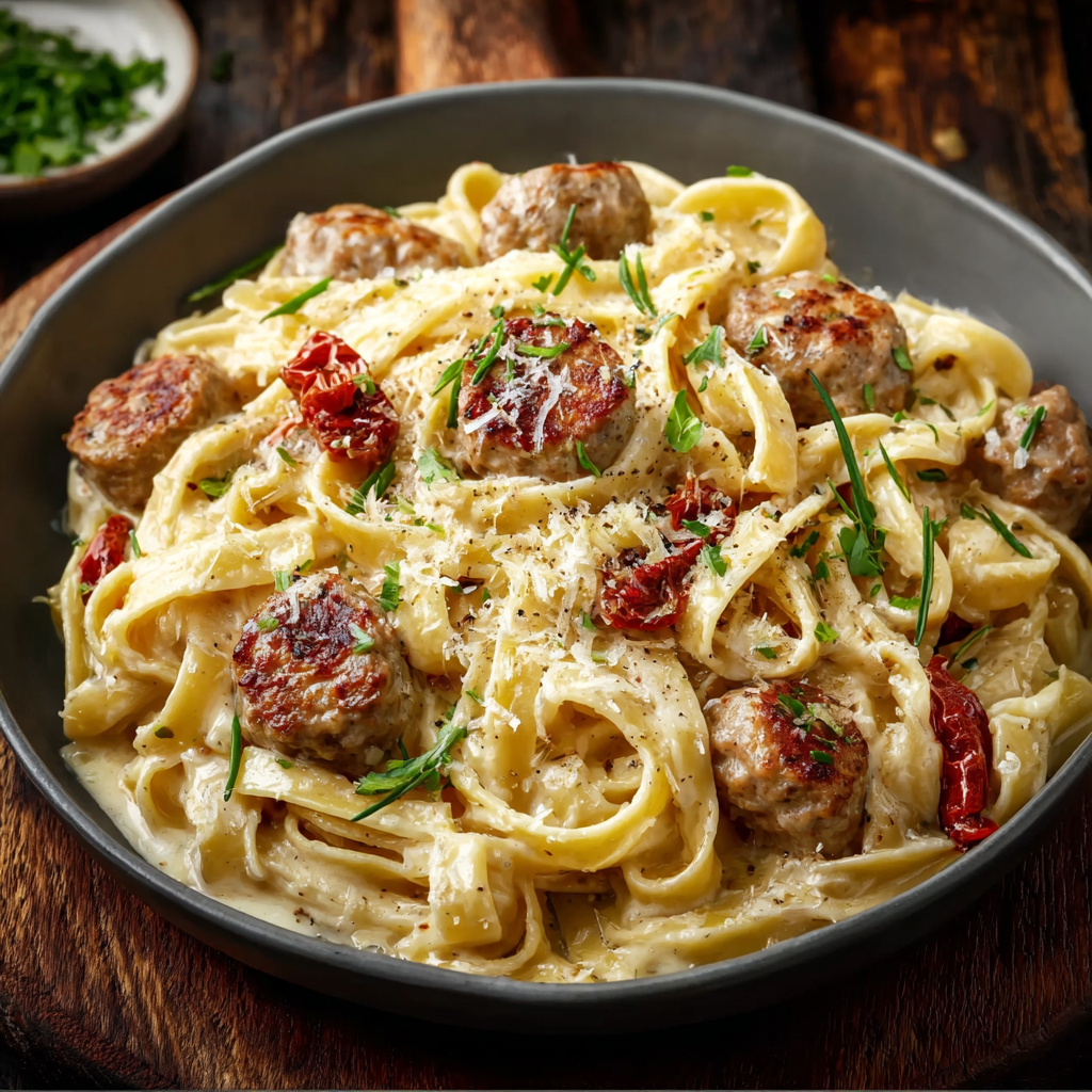 This creamy Italian sausage fettuccine removes every obstacle. Italian sausage — sweet, fennel-spiced, or hot according to preference — browned until the fat has rendered and the exterior is deeply caramelized, combined with garlic, shallots, sun-dried tomatoes, and white wine, finished with heavy cream and Parmesan into a sauce that is simultaneously light enough to coat fettuccine without weighing it down and rich enough to taste like it simmered for hours. The rendered sausage fat is the technical foundation of the entire sauce — it carries the fennel, garlic, and paprika flavors from the sausage into every tablespoon of cream and every strand of pasta, producing a cohesion and depth that no added seasoning can replicate.