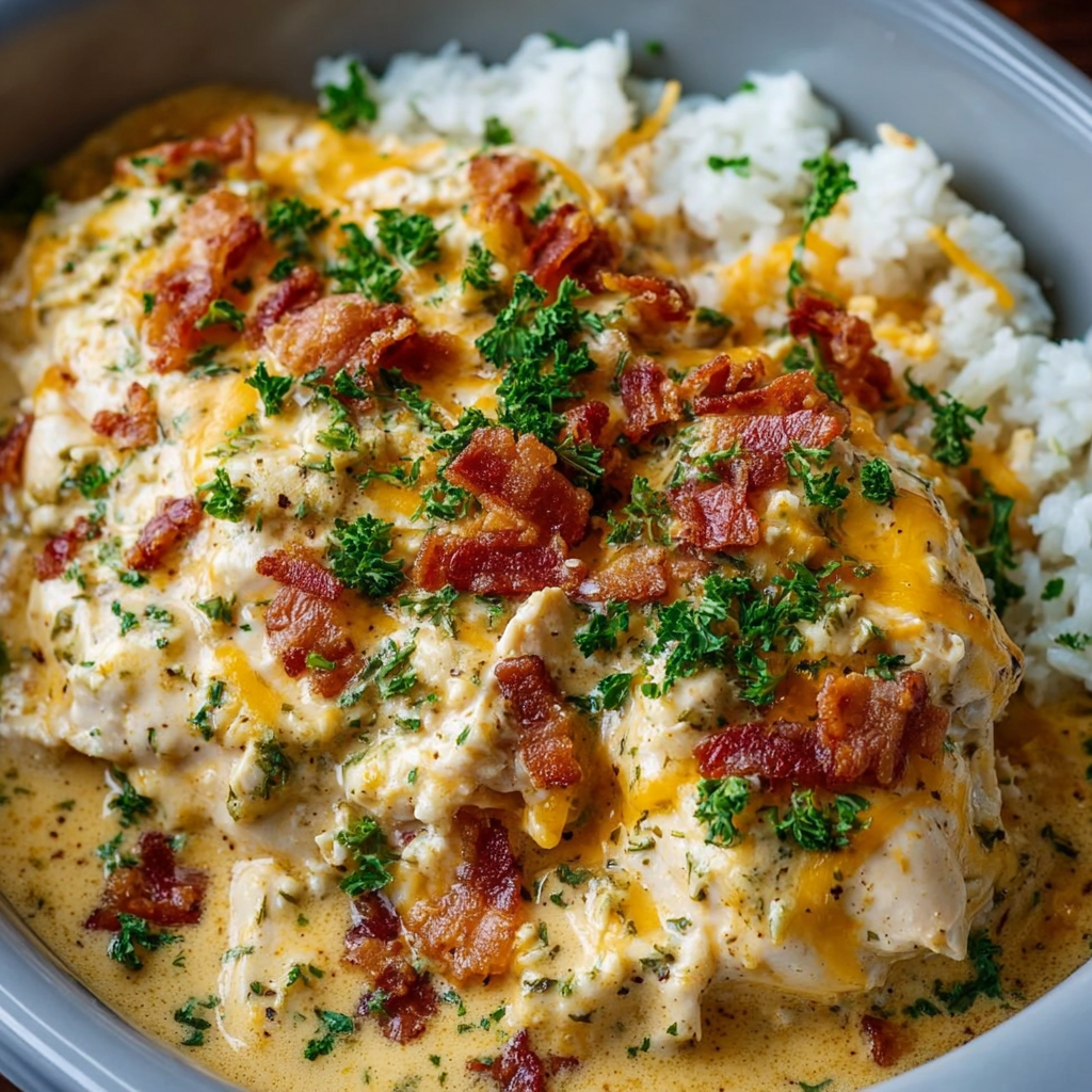 During the final 30 minutes of cooking — or while setting up the slow cooker in the morning if using pre-cooked bacon — cook the bacon strips in a cold skillet over medium heat until deeply golden and crispy. Drain on paper towels and crumble into irregular pieces when cool. The bacon is added after shredding rather than during cooking — adding it at the beginning would produce soggy, grey bacon that contributes flavor but loses all textural contribution. Added at the end, the bacon provides crispy textural contrast against the creamy chicken.