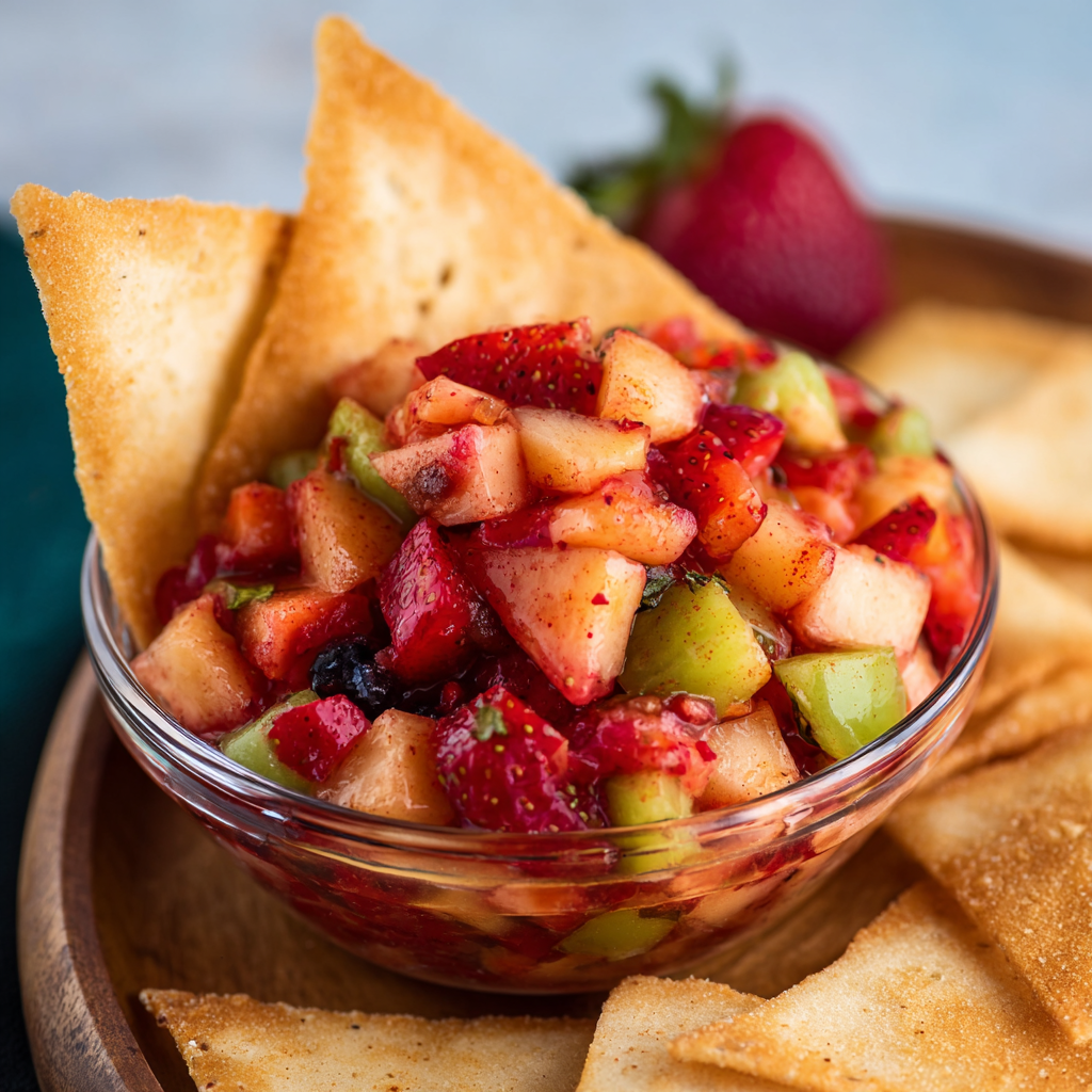 Juicy chopped fruit tossed with a hint of citrus pairs perfectly with crispy, sweet tortilla chips coated in cinnamon sugar. Itβs light, colorful, and perfect for parties, snacks, or a fun dessert.
