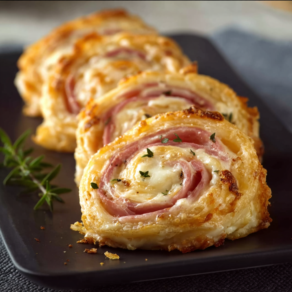 Party appetizer rounds: Slice the roll into 2cm rounds immediately after the resting period and arrange on a serving platter cut-side up — the spiral of ham and cheese and the golden pastry layers are visible from above and create a visually striking presentation that requires no additional decoration.