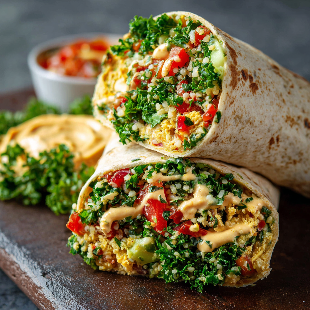 Higher protein: Add a layer of sliced grilled chicken breast, baked falafel, or pan-fried tempeh strips inside the wrap alongside the tabbouleh. Each option adds 15–25 grams of additional protein per serving.
