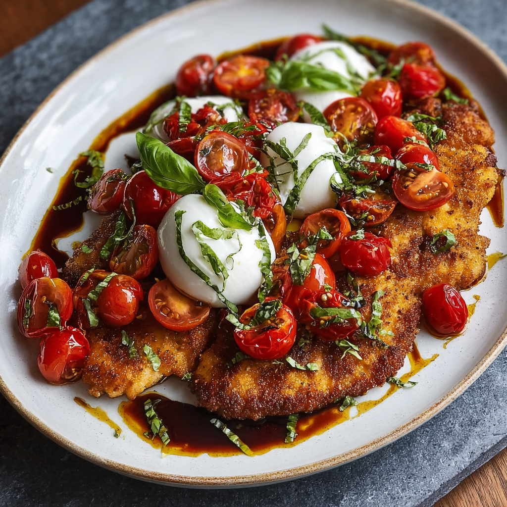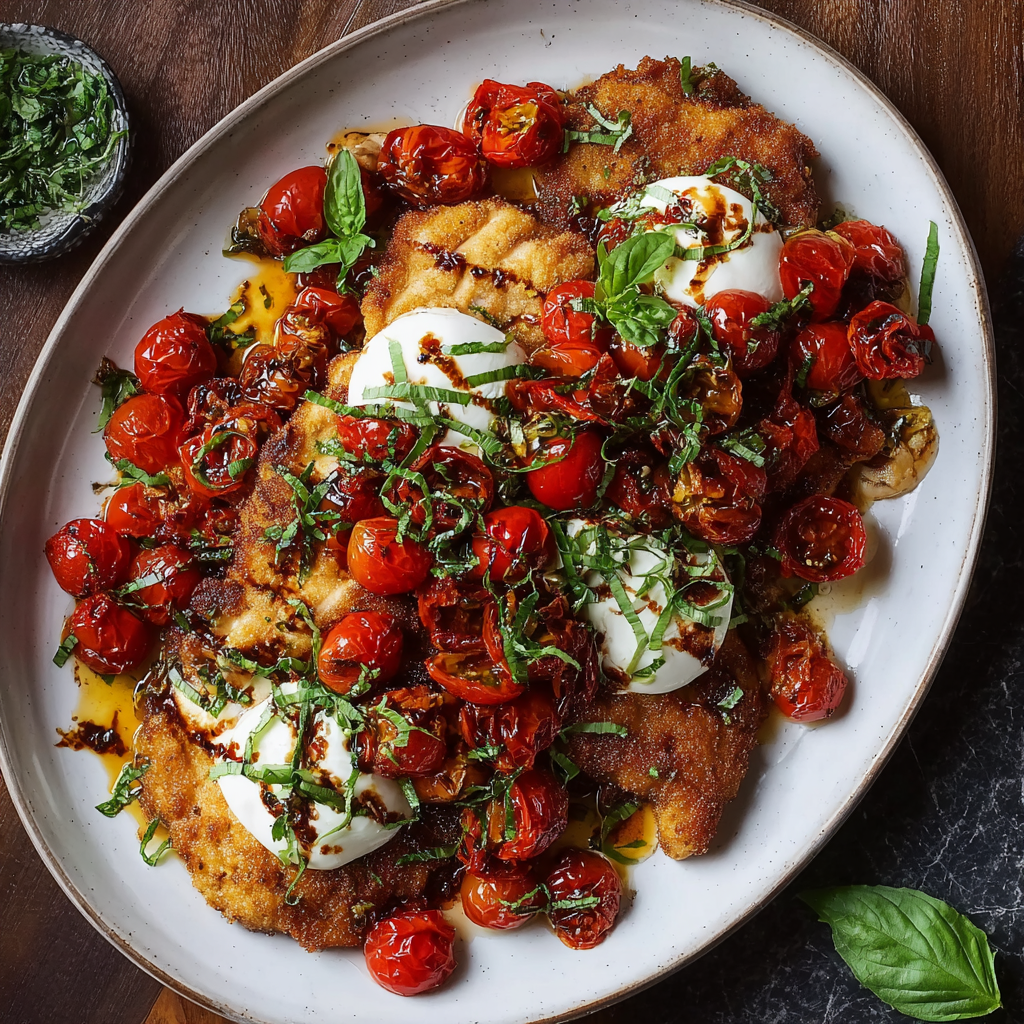 Italian-Style Chicken Cutlets with Cherry Tomatoes and Burrata combine crispy chicken, sweet blistered tomatoes, and creamy burrata into a vibrant, flavorful dish. Perfect for quick weeknight dinners or a gourmet Italian-inspired meal. Try it today, share your feedback in the comments, and subscribe for more delicious recipes.
