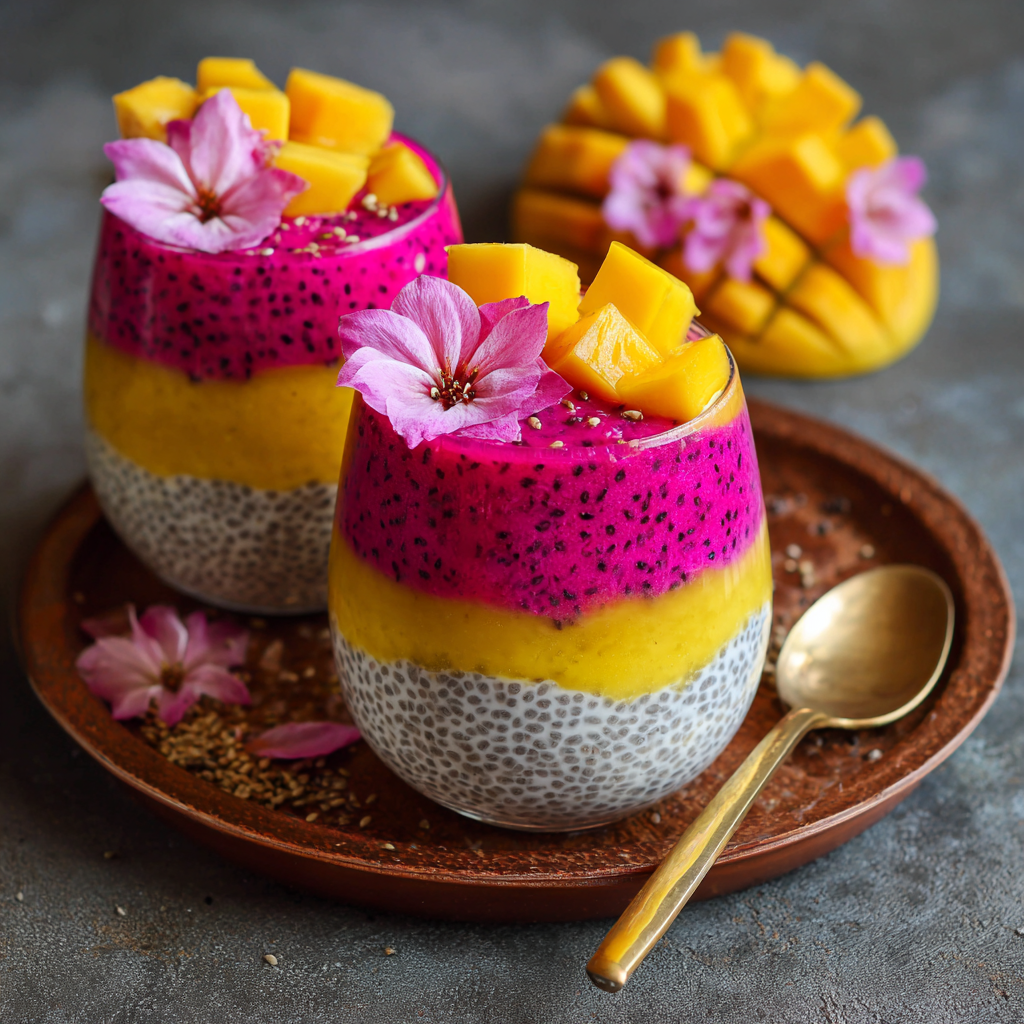 This Mango & Dragon Fruit Chia Pudding: A Tropical, Nutrient-Packed Delight is a vibrant, refreshing, and nutrient-dense breakfast or snack. It layers creamy chia pudding with sweet mango and exotic dragon fruit for a visually stunning and naturally energizing dish that feels like dessert but fuels your body like a superfood meal.