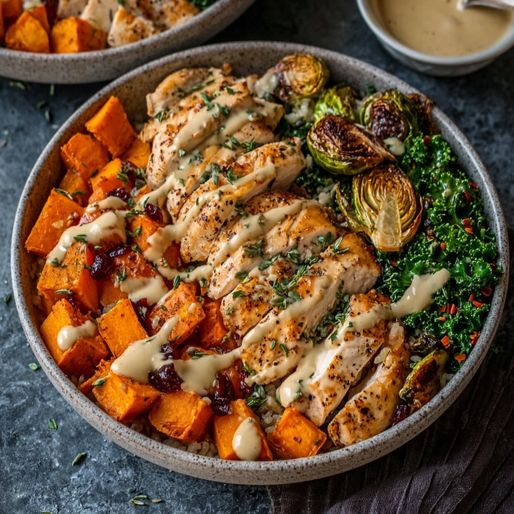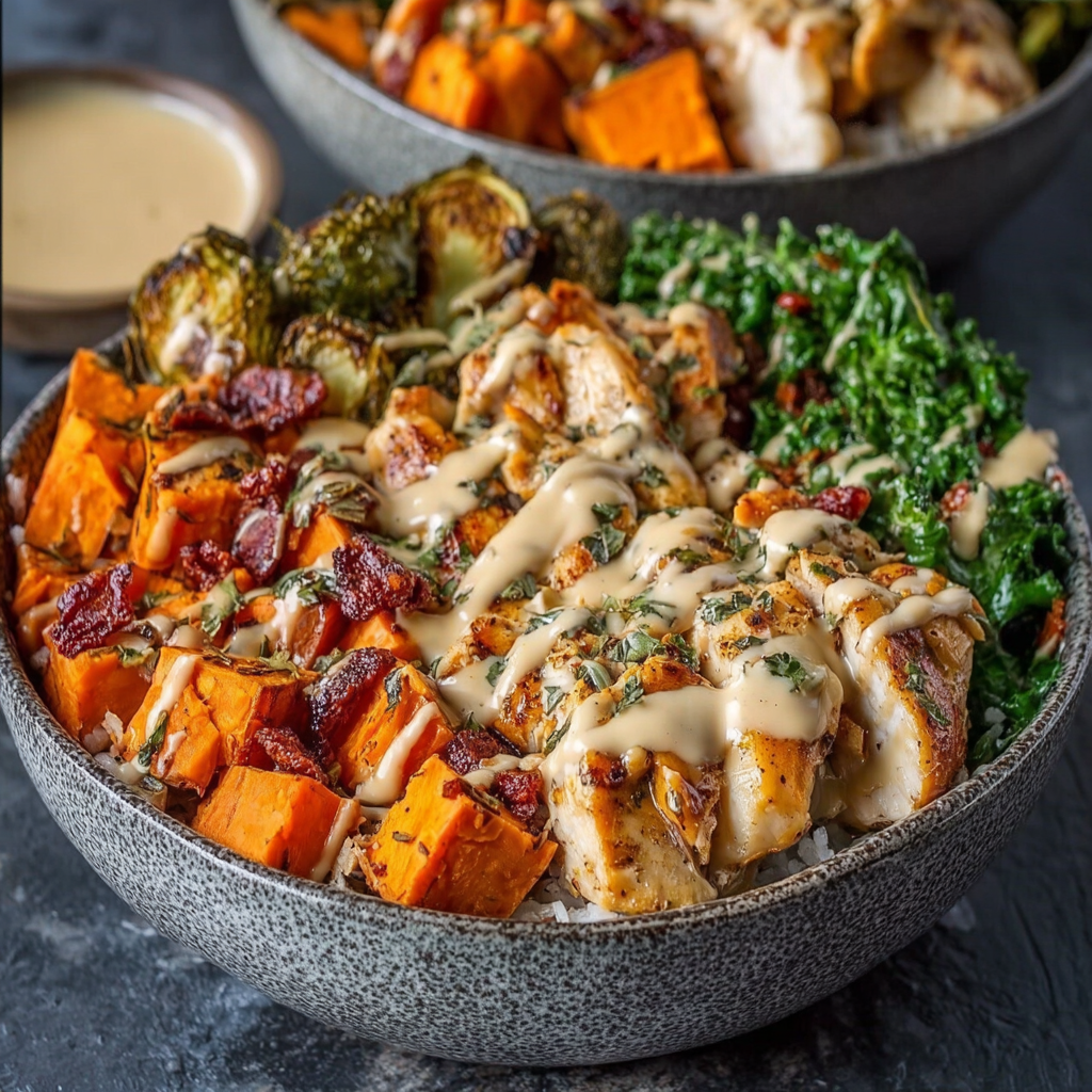 The maple Dijon sauce is the axis around which everything in this bowl rotates. It is simultaneously sweet, tangy, savory, and just sharp enough from the mustard to cut through the natural sweetness of the roasted sweet potato and the richness of the chicken — a four-ingredient sauce that behaves like something a restaurant spent weeks developing. Paired with caramelized sweet potatoes, seared high-protein chicken, and a base of your choice, this bowl delivers 45+ grams of protein, genuine flavor complexity, and the kind of satisfying completeness that makes it one of the most repeatable recipes in any weekly rotation.
