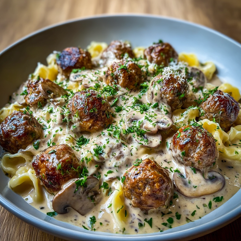 Here is a question worth asking on any evening when comfort food is the only acceptable answer: what happens when you take the two most satisfying elements of two separate classic dishes — the deeply flavored, yielding meatball from Italian-American cooking and the silky, tangy, mushroom-enriched cream sauce from Russian stroganoff — and combine them into a single preparation that honors both traditions while producing something more compelling than either achieves independently?