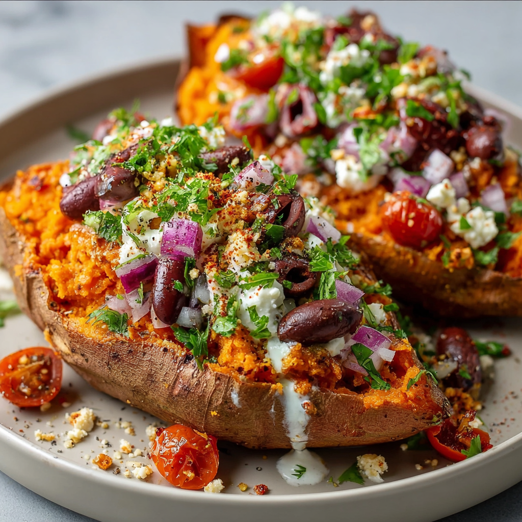Lower carbohydrate: Replace the sweet potato with a large portobello mushroom cap or a halved roasted acorn squash — both provide a vessel for the Mediterranean filling with fewer carbohydrates. The flavor profile of the filling works equally well with either substitute.