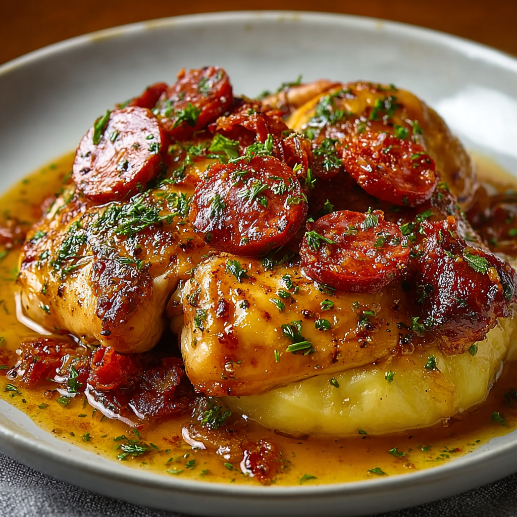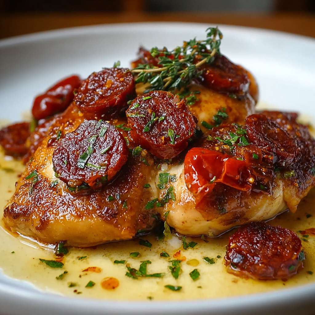 Here is a question worth asking the next time a weeknight dinner needs to be both fast and genuinely memorable: what happens when you combine two of the most flavor-efficient proteins in any kitchen — chicken thighs and Spanish chorizo — in a single pan, allow the chorizo fat to render into a deeply colored, paprika-rich cooking medium, and let the chicken braise in that fat alongside white wine, tomatoes, and garlic until it is tender enough to pull apart with a spoon? According to a 2024 global ingredient trend report by Euromonitor International, Spanish chorizo ranks as the fastest-growing charcuterie ingredient in home cooking globally — driven by the understanding that a relatively small quantity of high-fat, intensely spiced cured sausage can transform an otherwise ordinary dish into something that tastes like it has been cooking for hours.