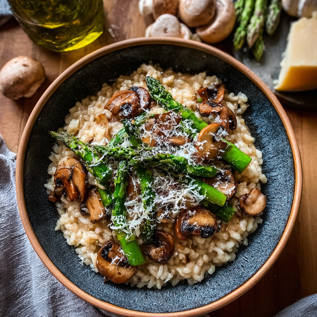 Mushroom and asparagus risotto proves that the most intimidating preparations in Italian cooking are frequently the most rewarding ones to understand — because once the principle of gradual starch release, warm stock, and the cold-butter mantecatura is grasped, every risotto becomes reliable, every variation becomes possible, and the dish that once seemed exclusively the province of professional kitchens becomes one of the most satisfying things you can make on a Tuesday evening with a box of rice and a pan of warm stock.