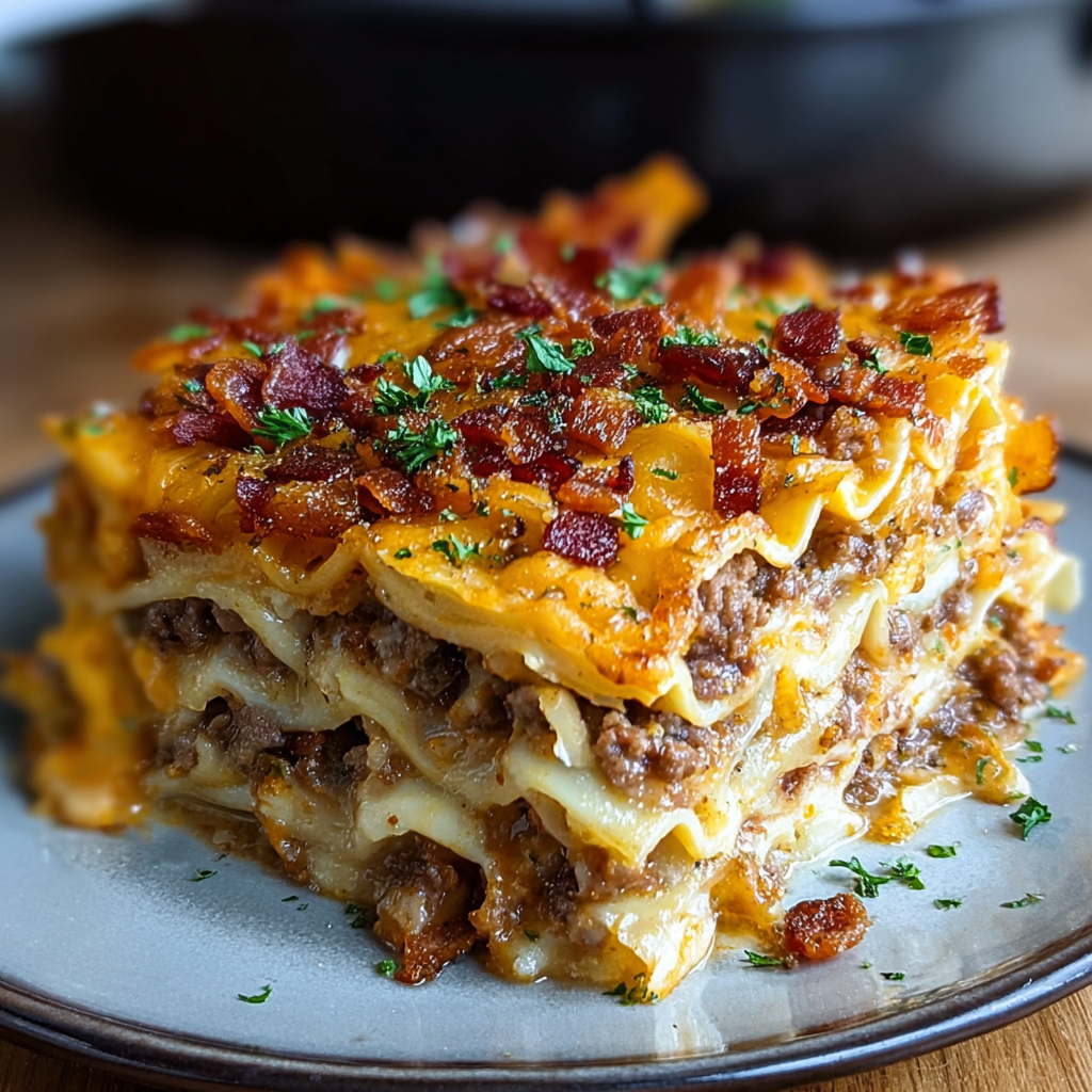 This Parmesan Garlic Bacon Cheeseburger Lasagna takes everything you love about a bacon cheeseburger and turns it into a rich, layered baked pasta dish.