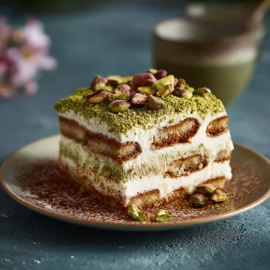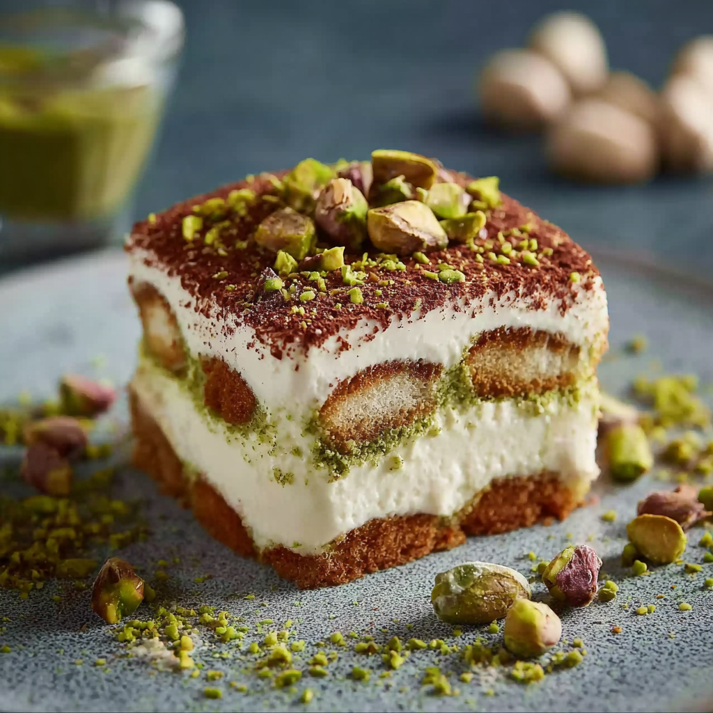 This pistachio cream tiramisu is the dessert that results when that Sicilian tradition meets the classic Northern Italian layered dessert. Ladyfinger biscuits soaked in a sweetened pistachio milk instead of espresso, layered with a mascarpone cream enriched with real pistachio paste, and finished with crushed pistachios rather than cocoa powder — it is simultaneously faithful to the spirit of tiramisu and genuinely, distinctly its own creation. The flavor is more delicate than the original, the color is extraordinary, and the response from anyone who tries it for the first time is, without exception, a request for the recipe.