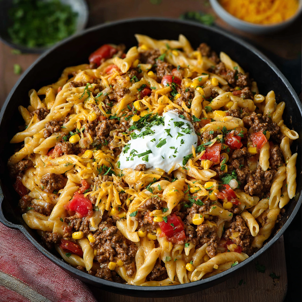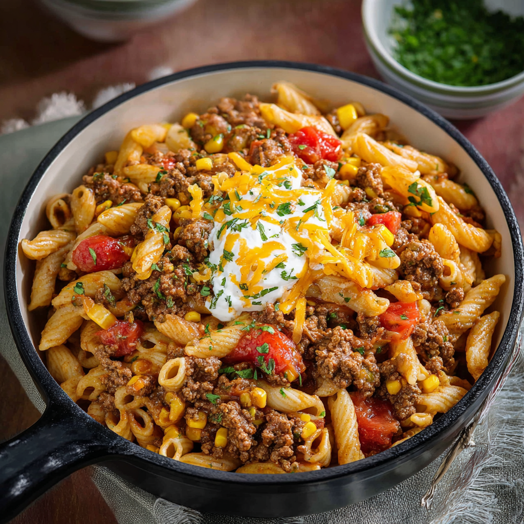 Southwest Ground Beef Pasta ๐ŸŒฎ๐Ÿ (Bold, Cheesy & One-Pan Comfort)