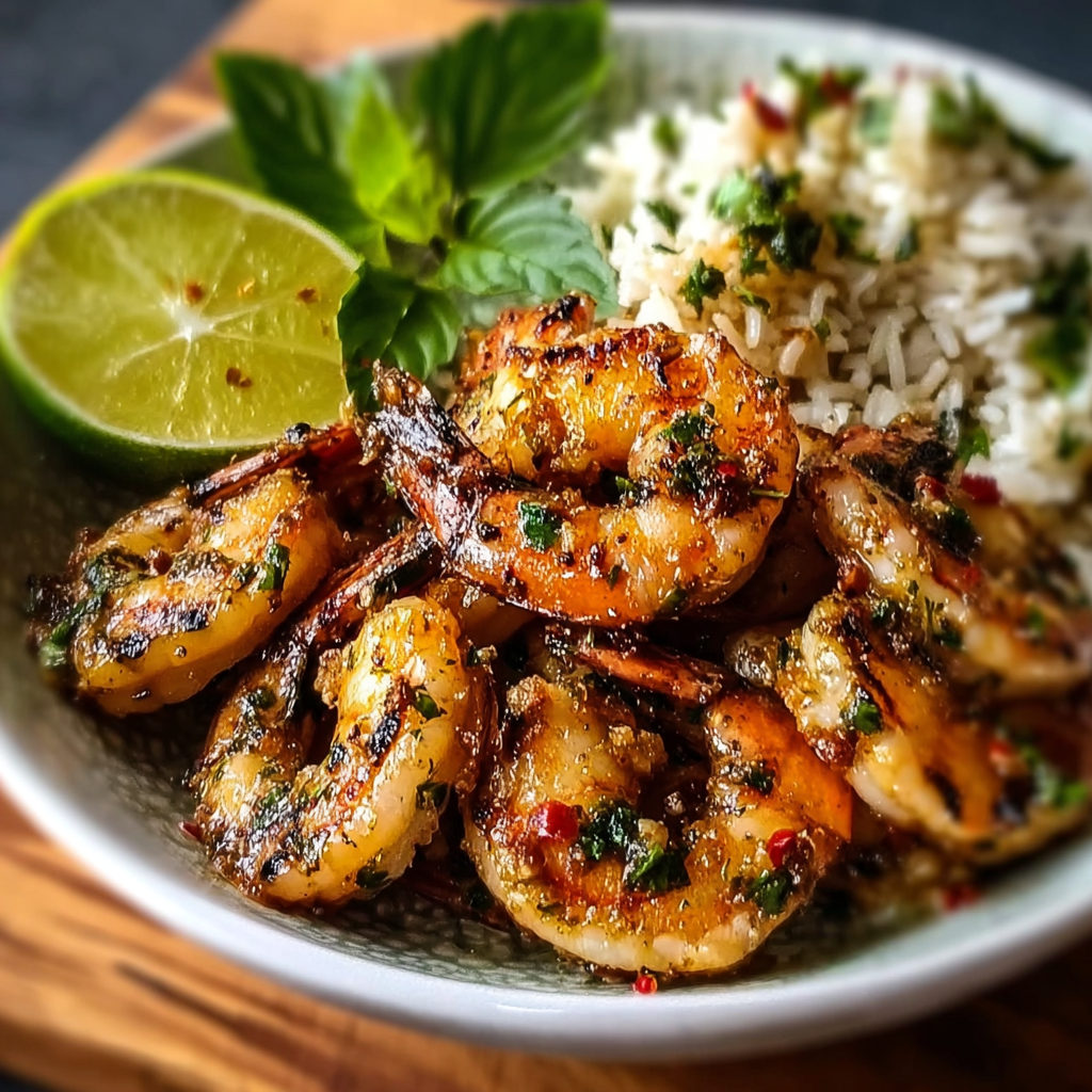 Thai Grilled Chili Lemongrass Shrimp with Basil Lime Fried Rice