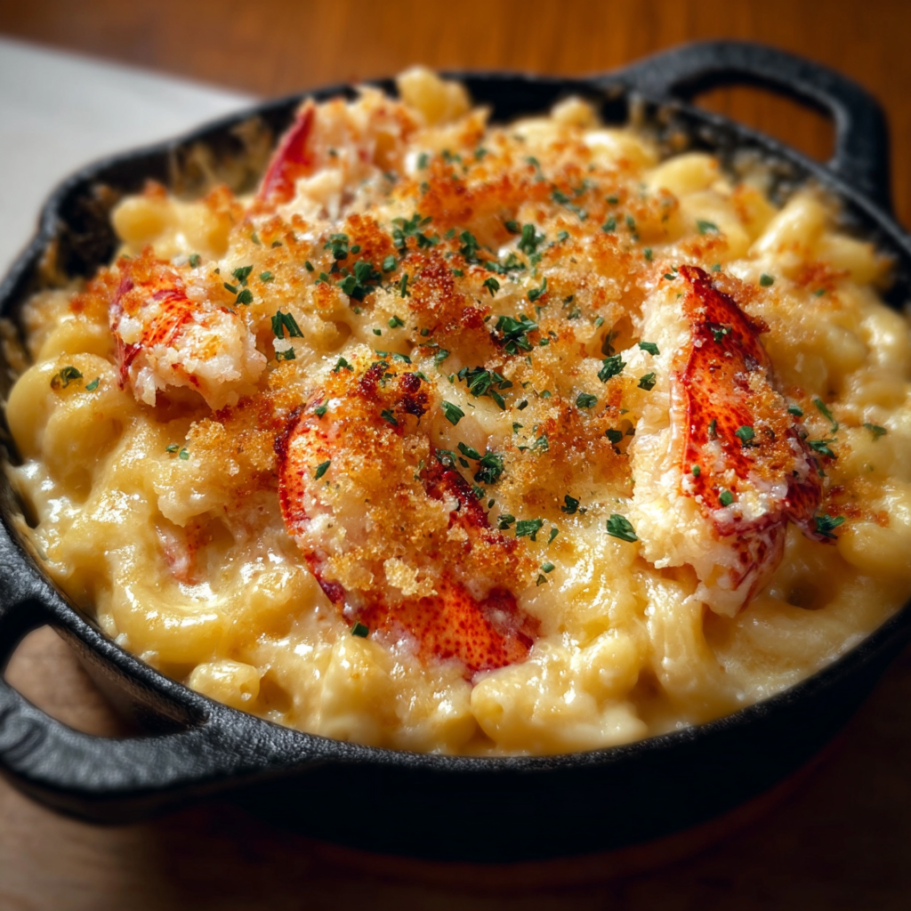 As a dinner party showpiece: Bake in individual cast iron skillets or ramekins and serve directly in the vessel — each guest receives their own personal, bubbling, perfectly browned mac and cheese with whole pieces of lobster visible on the surface. This individual presentation communicates both luxury and care simultaneously.