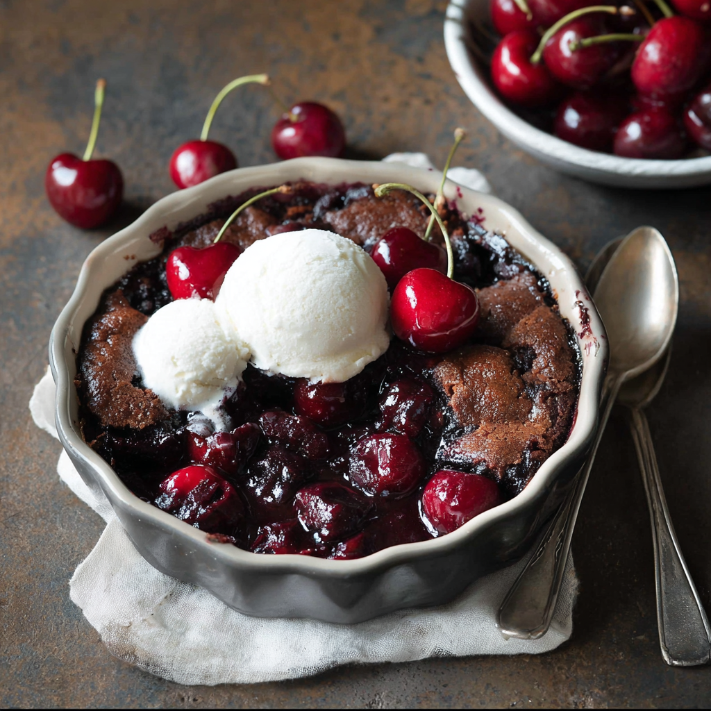 With coconut whipped cream and fresh herbs: Top each serving with a generous cloud of lightly sweetened coconut whipped cream and a small scattering of fresh mint leaves or a single sprig of fresh thyme. The herbal freshness cuts through the richness of the chocolate-cherry combination with surprising elegance and transforms a homey cobbler into something that reads as genuinely sophisticated.
